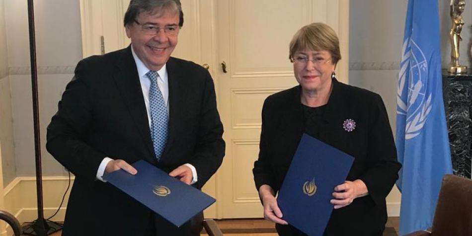El canciller Carlos Holmes Trujillo y Michelle Bachelet firmaron en Ginebra, Suiza, el acuerdo que renueva el mandato por tres años de la Alta Comisionada para los Derechos Humanos de Naciones Unidas.