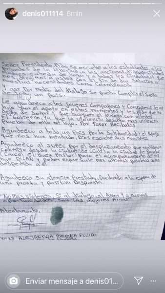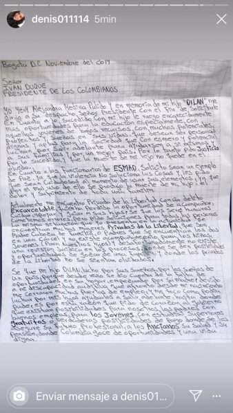 Yenny Alejandra Medina Pulido, madre de Dilan Cruz, el joven que murió tras ser impactado en la cabeza por un elemento disparado por miembro del Esmad, le envió una carta al presidente Iván Duque desde la cárcel.
