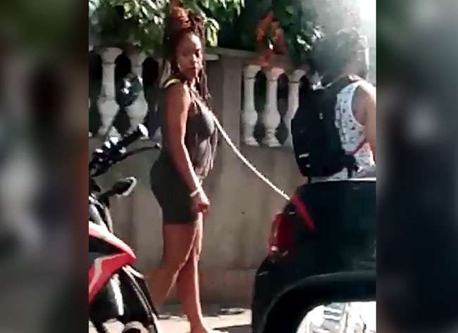 Se trata de una pareja, al parecer, de origen norteamericano, que caminaba por la Avenida San Martín, exclusivo sector de Bocagrande, pero lo curioso es que la mujer tenía atado alrededor de su cuello una cadena que era sostenida por el hombre con su mano derecha.