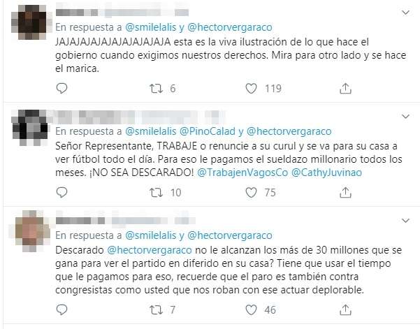 Tras esta polémica publicación los comentarios de los cibernautas no se hicieron esperar y le pidieron a Vergara Sierra que trabaje o sino que renuncie a su curul para que pueda irse a ver los partidos de fútbol a su casa todo el día.