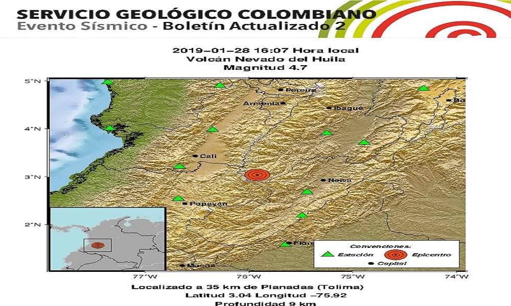 En horas de la tarde de este lunes 28 de enero, un fuerte sismo de magnitud 4.7, con epicentro en el volcán Nevado del Ruiz y a una profundidad de nueve kilómetros, sacudió varias regiones del país informó el Servicio Geológico Colombiano.