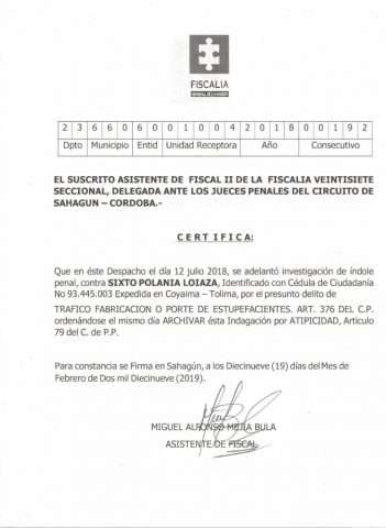 Sin embargo, asumida la investigación por la Fiscalía Seccional Sahagún, se determinó que Polonia Loaiza no era autor de la conducta endilgada por La autoridad de Policía, procediendo a declarar la Atipicidad de la Conducta ordenando el Archivo del proceso de forma inmediata.