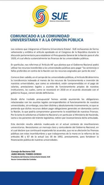 De igual forma, el presidente del SUE, Javier Torres Oviedo, consideró como un irrespeto para la educación pública superior, que el artículo, el cual hace parte del Presupuesto General de la Nación para el año 2020, haya sido aprobado.