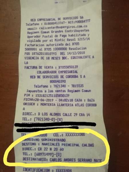 Segundo paso: le pasan el nombre de la persona con cédula para que efectué su pago, efectuado este se envía el recibo de giro al número celular vía WhatsApp + 57 302 3514239, a nombre de Carlos Serrano en Manizales, con los datos del comprador, dirección y ciudad. Anteriormente ya ha escogido modelo y talla.