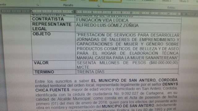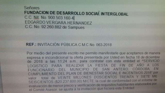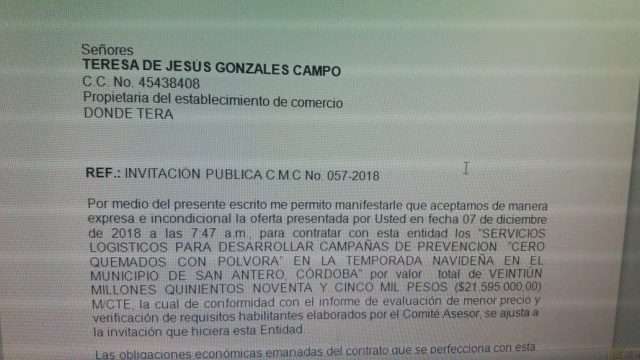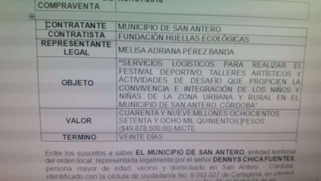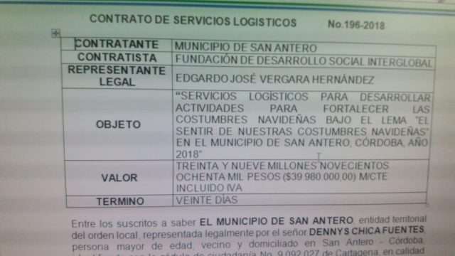 Otro de los contratos que es cuestionado fue “servicios logísticos para desarrollar actividades para fortalecer las costumbres navideñas bajo el lema El sentir de nuestras costumbres navideñas en el municipio de San Antero Córdoba año 2018” el cual se llevó a cabo en 20 días.