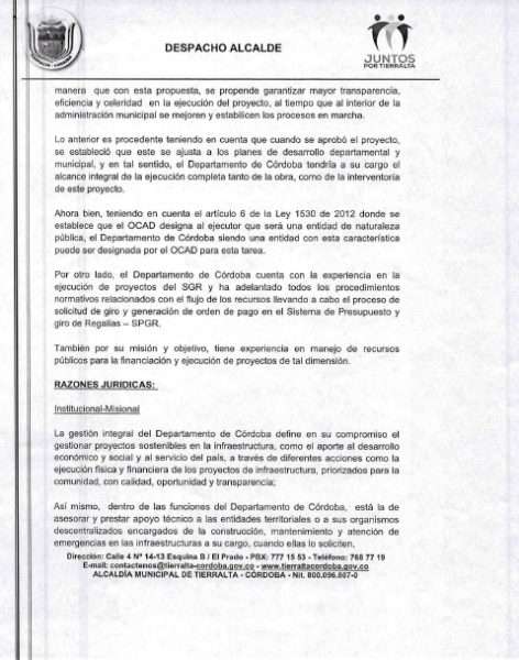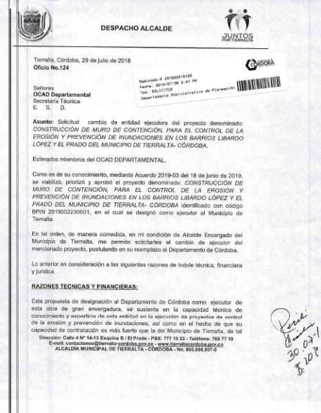- A través del OCAD del Sistema de Regalias el proyecto de construcción de las obras de la muralla recibió visto bueno y quedó asegurado su financiación y el Municipio de Tierralta, sería el ejecutor de la obra.
