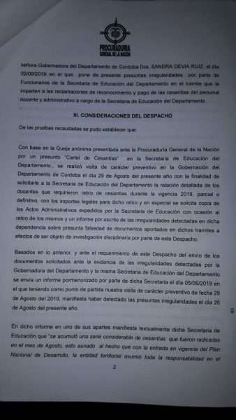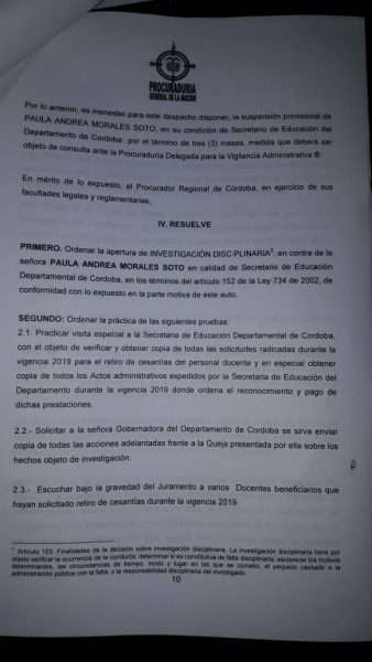 El órgano de control regional de Córdoba en cabeza de Nicolás José Barguil Flórez, también ordenó la apertura del proceso disciplinario contra la funcionaria por anomalías en el trámite que le imparten a las reclamaciones de reconocimiento y pagos de las cesantías de personal docente y administrativo adscrito a dicha Secretaría.