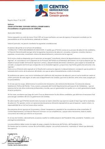 El directorio nacional del partido Centro Democrático, dio respuesta en las últimas horas a los reparos que realizaron tres precandidatos a la gobernación de Córdoba sobre los mecanismos de escogencia del candidato que se quedaría con el aval para entrar a la carrera por quedarse con el Palacio de Naín.