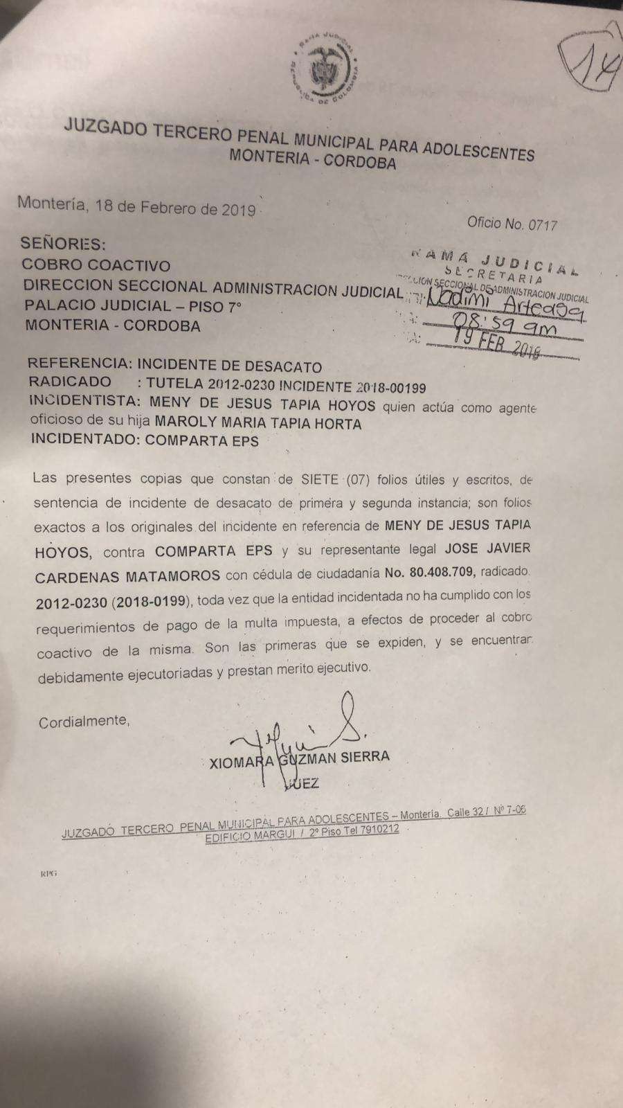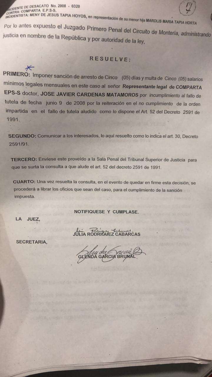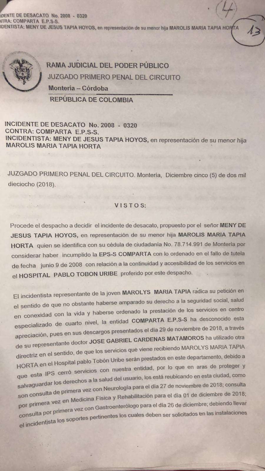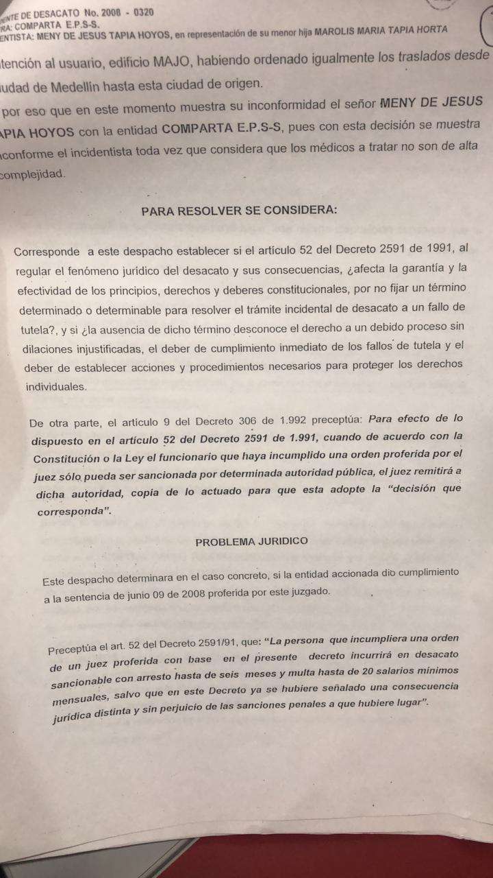 Lo que llama atención sobre este caso, es que a pesar que existen dos incidentes de desacato contra la EPS y una sanción de orden de arresto contra su representante legal, José Javier Cadenas Matamoros, Comparta aún no se ha dignado a ordenar nuevamente los tratamientos de la joven Maroly y además le niega los medicamentos que ella necesita