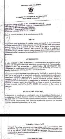 Esta decisión es tomada, tras el desacato de un fallo proferido el día 5 de julio del 2018 por medio del cual se le amparaban los derechos fundamentales al trabajo, igualdad y petición a Carlos Campo Monterroza, docente de matemáticas de la Institución Educativa Santa Lucia, en el municipio de San Andrés de Sotavento.