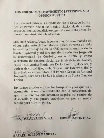 Finalmente, el movimiento Jattinista invitó a todos los loriqueros a «acompañar a nuestro candidato con la convicción de que el municipio que amamos seguirá su rumbo de desarrollo».
