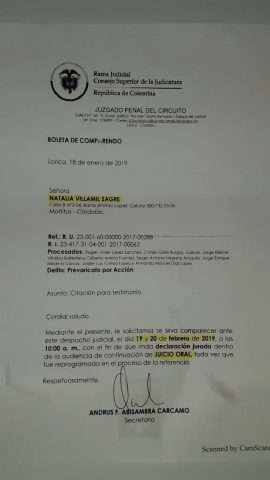 En el proceso, Natalia Villamil, expersonera del municipio (17 de octubre de 2013 al 9 de febrero de 2016) quien resultó perjudicada pues participó en la convocatoria donde fue elegido Martínez Castelar, figura como testigo del caso.