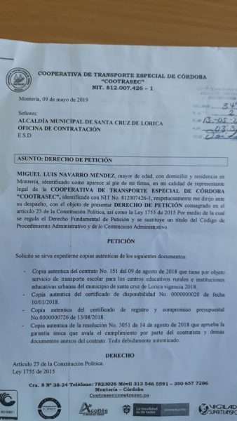“Copia autentica del contrato No 151 de 09 de agosto de 2018 que tiene por objeto servicio de transporte escolar para los centros educativos rurales e instituciones educativas urbanas del municipio de San Cruz de Lorica vigencia 2018” se lee en el documento.