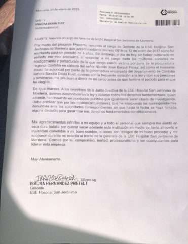 Hace pocos minutos se conoció que Isaura Hernández Pretelt, renunció a su cargo como gerente del Hospital San Jerónimo de Montería.