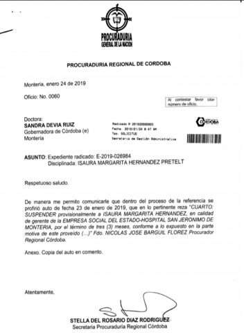 En las últimas horas de este jueves 24 de enero, la Procuraduría General de la Nación suspendió provisionalmente por el término de tres meses a la gerente de la ESE Hospital San Jerónimo de Montería, Isaura Margarita Hernández Pretelt.