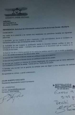 En este orden de ideas, el Movimiento Juvenil Cereteano está a la espera de una respuesta por parte de la empresa en cuanto a un pliego de peticiones que elevaron con el fin de poder llegar a un consenso, sin embargo Sotracor hasta el momento asegura que se mantendrá en la tarifa establecida.
