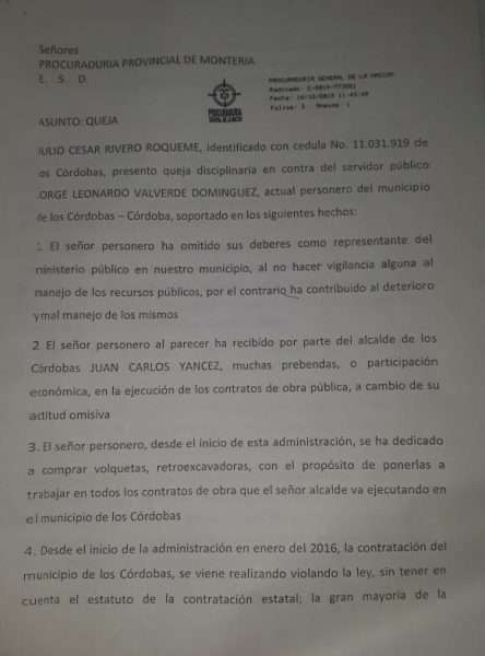 La queja interpuesta afirma que Valverde Domínguez, al parecer, ha recibido por parte del alcalde de Los Córdobas, Juan Carlos Yances, muchas prebendas “en la ejecución de los contratos de obra pública a cambio de su actitud omisiva”.