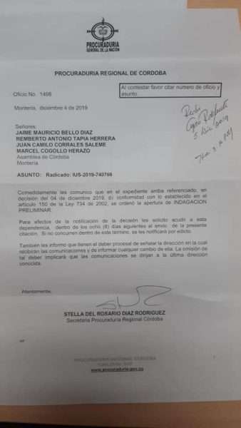 En las últimas horas se conoció que el miércoles 4 de diciembre la Procuraduría Regional de Córdoba abrió una investigación preliminar contra 3 diputados cordobeses y el secretario general de la Asamblea, Marcel Cogollo Herazo.