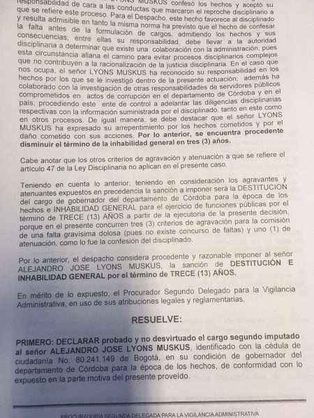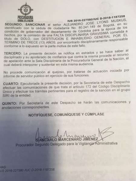 En las últimas horas de este miércoles 26 de junio, se conoció que la Procuraduría General de la Nación destituyó e inhabilitó por 13 años al exgobernador de Córdoba, Alejandro Lyons.