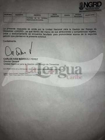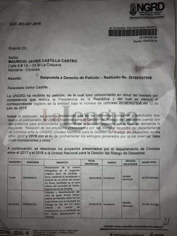 La Lengua Caribe conoció en exclusiva un documento que corresponde a la respuesta de un derecho de petición interpuesto por Mauricio Castilla Castro, donde solicita la “relación de los proyectos presentados por los distintos alcaldes del departamento de Córdoba ante la UNGRD en los años 2017 y 2018 con el fin de contrarrestar los estragos por la ola invernal, tales como inundaciones y otros”.