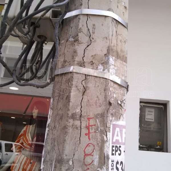La columna del poste ya se encuentra un poco inclinada y tal como se observa en las imágenes, la base está totalmente destruida, al punto que los cables ya se pueden observar.