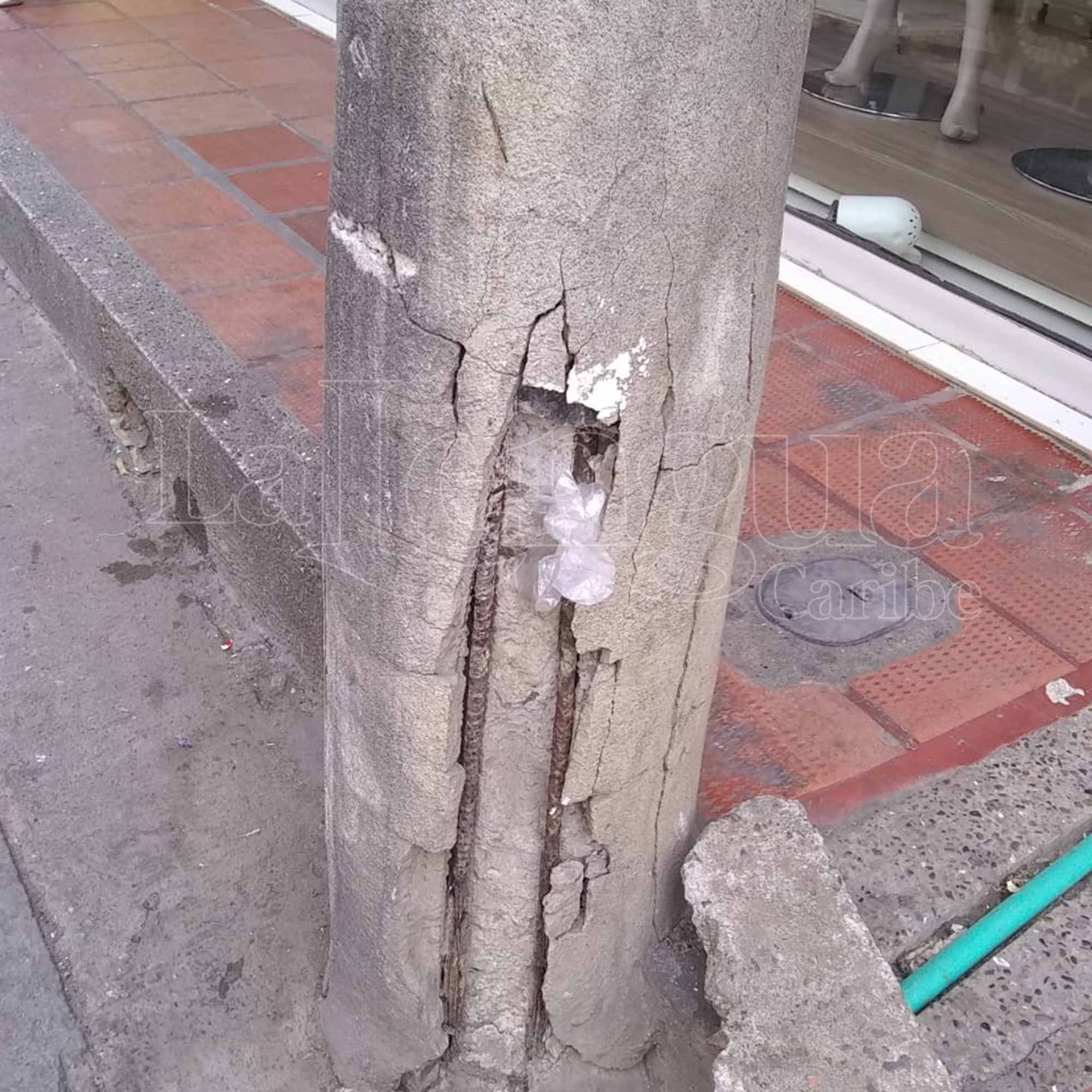 La columna del poste ya se encuentra un poco inclinada y tal como se observa en las imágenes, la base está totalmente destruida, al punto que los cables ya se pueden observar.