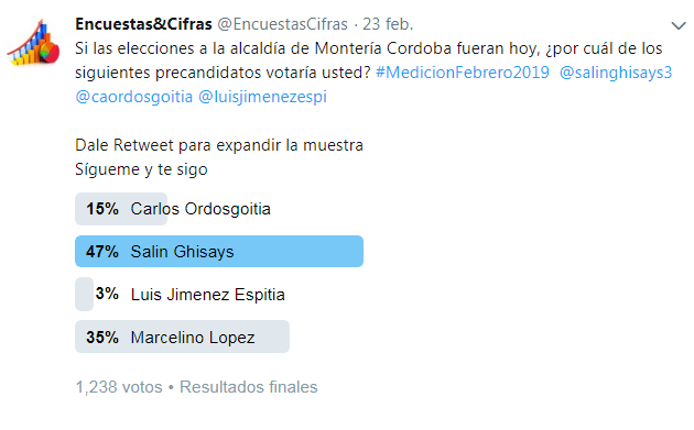 Para el caso de la Alcaldía de Montería, en un sondeo realizado por Encuestas y Cifras a través de su cuenta de Twiiter, el administrador de empresas Salim Ghisays ocupó el primer lugar dejando muy por debajo a sus adversarios.