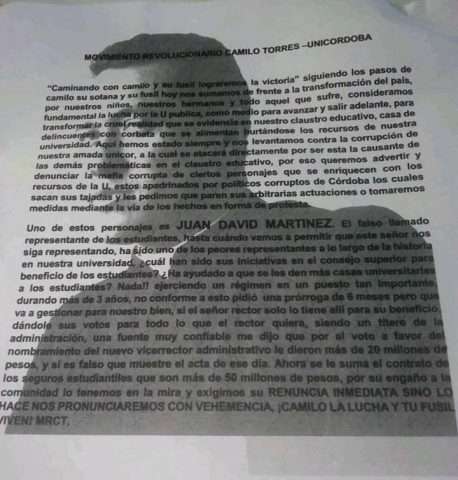 De acuerdo al panfleto que apareció en el Alma Mater en horas de la tarde de este miércoles 20 de febrero y que sería autoría del Movimiento Revolucionario Camilo Torres, “la mafia corrupta de ciertos personajes de la universidad que se enriquecen con los recursos son apadrinados por políticos corruptos de Córdoba, los cuales sacan sus tajadas y les pedimos que paren sus arbitrarias actuaciones o tomaremos medidas mediante las vías de hechos en forma de protesta”.