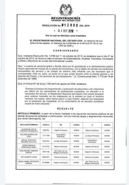En las últimas horas de este viernes 4 de octubre la Registraduría Nacional hizo pública la resolución por la cual ordenó el traslado de la registradora de Cereté, Jania Campo, al municipio de Sabanalarga Atlántico.