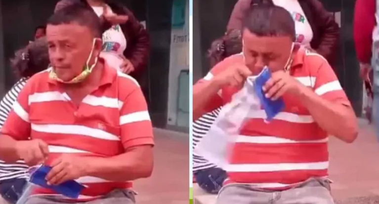 Además de manipular el tapaboca con sus manos, el hombre sopla la bolsa de empaque y termina de contaminar el producto que es utilizado por las personas como medida para evitar el contagio de Covid-19.