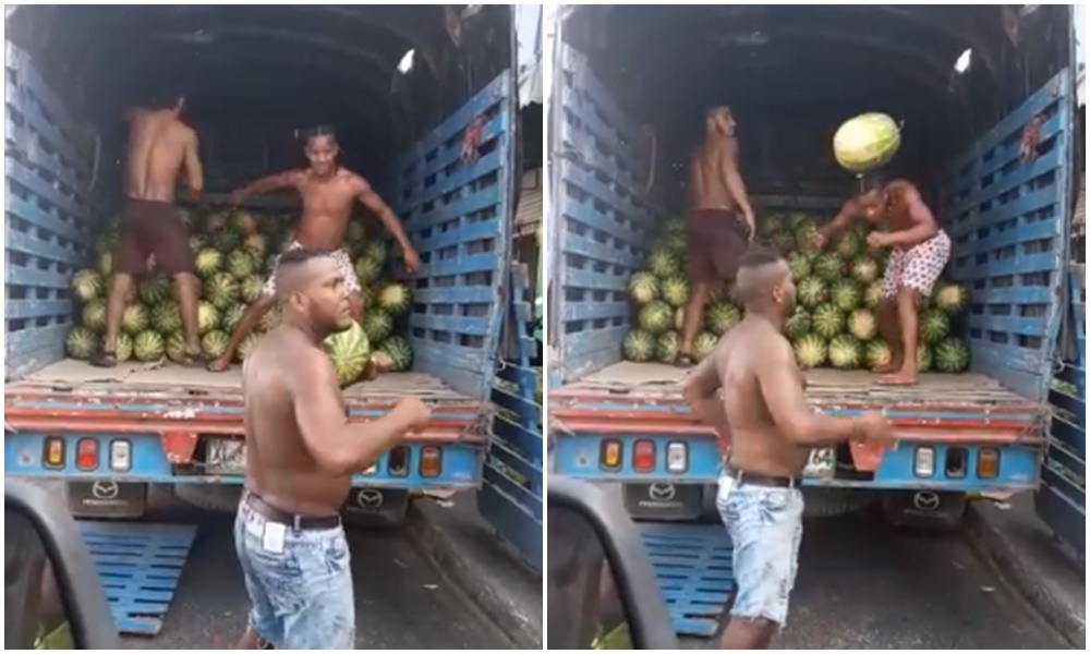 Se trata de un cargamento de patillas y los tres coteros utilizan sus extremidades para embarcar la fruta de una manera jocosa, para hacer su trabajo más sencillo y alegre.