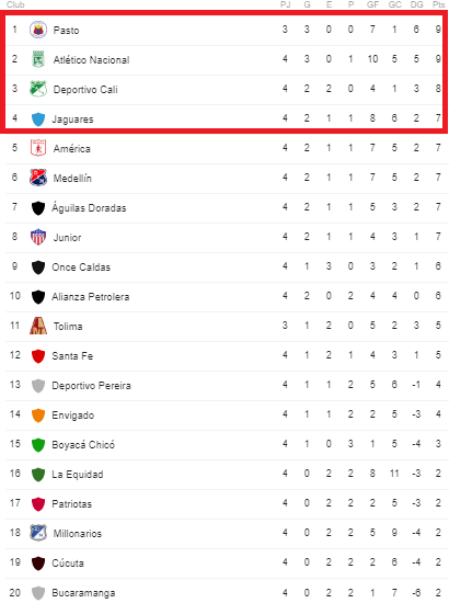 Deportivo Pasto (9), Atlético Nacional (9), Deportivo Cali (8) y Jaguares de Córdoba (7), marchan en las primeras cuatro casillas de la tabla de posiciones de la Liga BetPlay I-2020, tras finalizar la cuarta jornada de la fase regular.