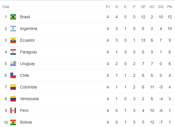 Detrás de la ‘canarinha’ se encuentra Argentina que suma 10 puntos, productos de tres triunfos y un empate, mientras que Ecuador completa el podio tras alcanzar las nueve unidades, seis de ellas obtenidas en esta doble jornada 3-2 en su visita a Bolivia y 6-1 de local ante Colombia.