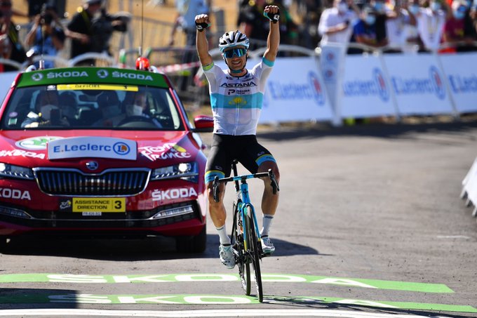 El pedalista kazajo Alexey Lutsenko se impuso este jueves 3 de septiembre en la sexta etapa del Tour de Francia 2020, una fracción de 191 kilómetros de recorrido entre Le Teil y el Mont Aigoual y que finalizó con un puerto de montaña.