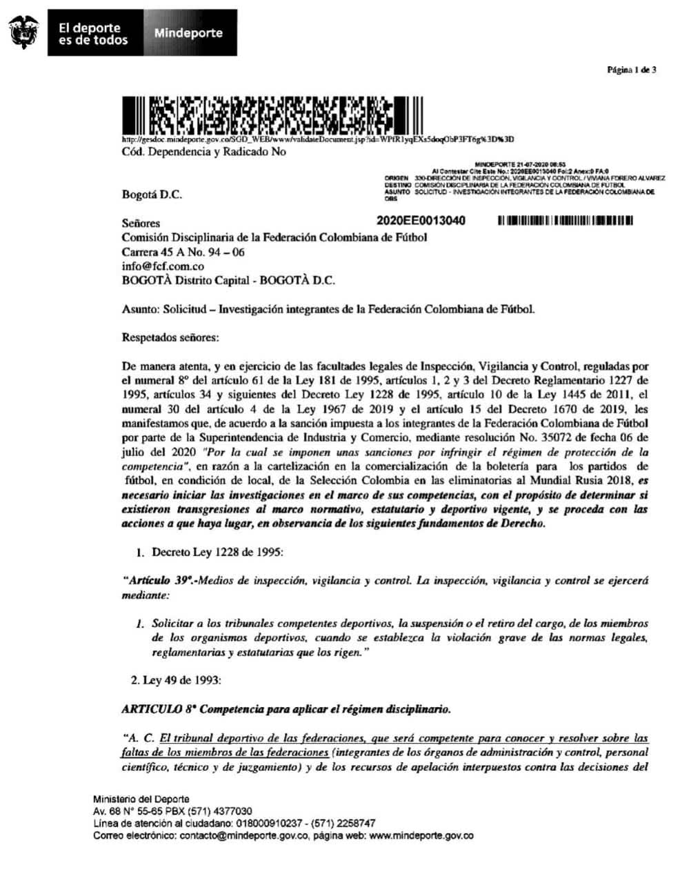El Ministerio del Deporte solicitó formalmente a la Comisión Disciplinaria de la Federación Colombiana de Fútbol la suspensión o retiro del cargo de las personas que están involucradas en el polémico caso de la reventa de boletería de los partidos de Eliminatorias al Mundial de Rusia 2018.