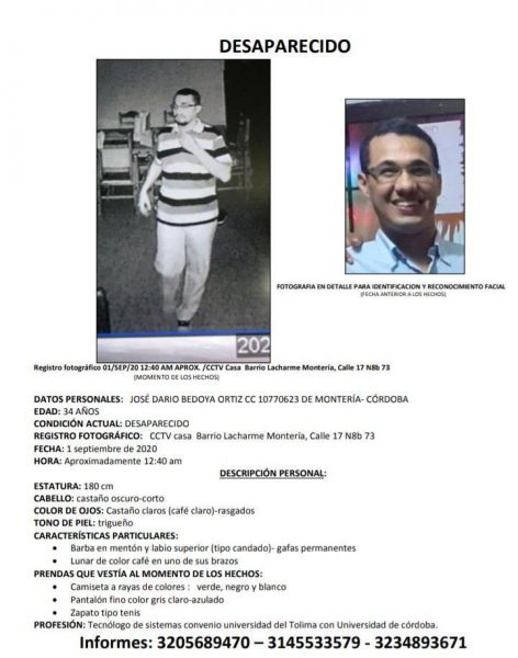 Quien tenga información sobre el paradero de José Dario Bedoya, puede comunicarse a los siguientes números celulares: 3205689470, 3145533579, 3234893671.
