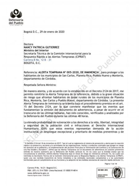 Recientemente, la Defensoría del Pueblo emitió un comunicado en el que advertían que el Clan del Golfo habría creado un nuevo frente llamado ‘Bajo Sinú’, el cual tendría accionar en esta subregión del departamento.