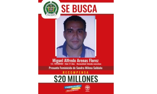 Una recompensa de 20 millones de pesos ofreció el gobernador de Cundinamarca, Nicolás García Bustos, por información que permita dar con el paradero de Miguel Alfredo Arenas Flórez, autor del asesinato de Sandra Milena Saldaña.