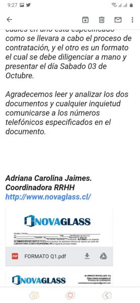 Se trata de una supuesta multinacional chilena llamada Aluminios Novaglass S.A., la cual asegura estar buscando posibles asistentes administrativos y personas para que laboren en un call center, con un sueldo de 1’800.000.