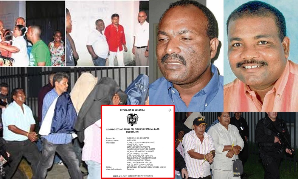 La providencia fue proferida por el Juzgado Octavo Especializado de Bogotá el día 9 de octubre del presente año, en la cual se condena a los señores: Alfredo Fidalgo Arrieta López, Aniris Muñoz Vera, Bonifacio Contreras Diaz, Isaías Enrique Martínez Castro, , Saul Carreazo Silgado, Oscar Dorio Álvarez Domínguez y José Feliz Martínez Bravo, a la pena privativa de la libertad de siete (7) años de prisión y multa de cinco mil (5.000) SMLMV e inhabilitación para el ejercicio de Derechos y Funciones públicas, por los delitos de Concierto Para Delinquir Agravado en la modalidad de promoción y financiamiento de grupos ilegales.