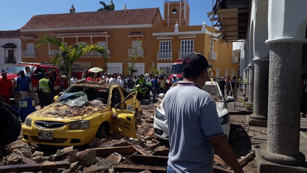 En pleno Centro Histórico de la ciudad de Cartagena se desprendió el balcón del edificio Maineron, lugar donde funcionan las oficinas del Banco BBVA en la sede de la Plaza de la Aduana, dejando como saldo una persona herida.