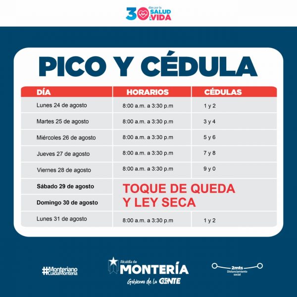 Este domingo 23 de agosto el alcalde de Montería, Carlos Ordosgoitia, dio a conocer el pico y cédula que regirá esta semana en la capital cordobesa.
