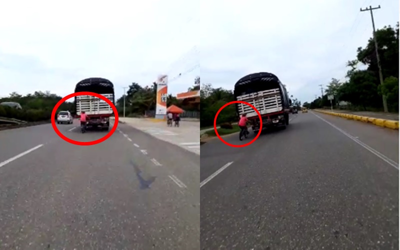 Un video aficionado da cuenta de cómo un joven, que, al parecer, es menor de edad, conduce una bicicleta, sin embargo, lo peligroso de este hecho es que se apoya en un camión que va a alta velocidad por la vía Montería – Cereté.