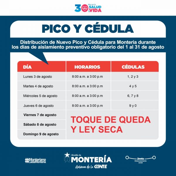 A partir de este lunes 3 de agosto, el pico y cédula se unificará en dígitos y horarios al decretado por la Gobernación, donde Montería hace parte de los municipios de afectación alta o moderada de Covid-19 y por ende dicha medida regirá entre las 8:00 de la mañana y las 3:00 de la tarde.