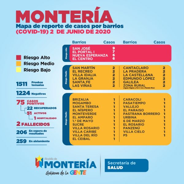 Es de resaltar que, Montería completó 75 contagios de los cuales 22 personas se han recuperado y dos han fallecido, es decir, hasta el momento hay 51 casos activos.