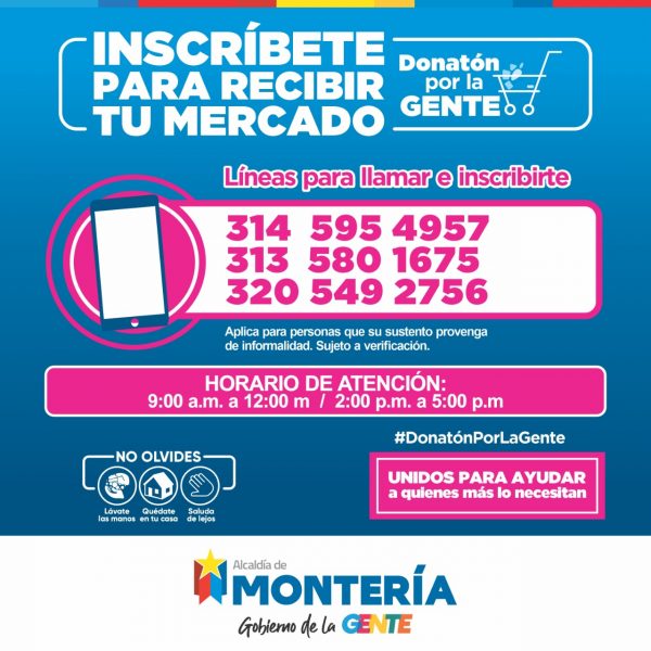 Aparte de las lineas que ya habían sido habilitadas, la Alcaldía de Montería autorizó otras tres líneas más, para que las personas que no vivan en zonas vulnerables y que devengue su sustento de la informalidad, se inscriban para que reciban mercados.