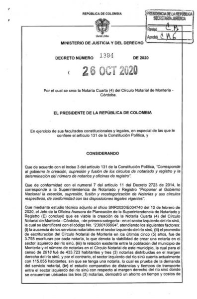 Mediante Decreto 1394 de 2020, el Gobierno Nacional aprobó la petición hecha por la Superintendencia de Notariado y Registro, el pasado 18 de marzo del año 2019, fue aprobada por la Presidencia de la República.
