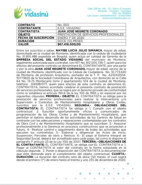 Un escándalo ha desatado los millonarios contratos que ha otorgado y firmado la gerente del Camu Vida Sinú, en Montería,  Nayibe Julio, pues no solo llama la atención las ‘jugosas’ y cuantiosas cifras de dinero sino que muchos de estos están a término de un año (12 meses), a sabiendas que la funcionaria deja su cargo en el mes de marzo.