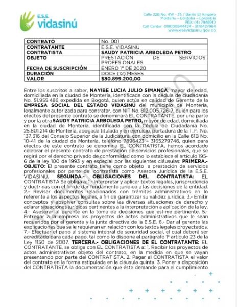 Otra beneficiada con estos contratos es Saudy Patricia Arboleda Petro, quien recibió uno por 80.899.200 a 12 meses. Asimismo, pero por un valor de 67.416.000, figuran Juan Carlos Vergara Meza, Angélica Carolina Cabrales y Juan José Negrete Coronado.