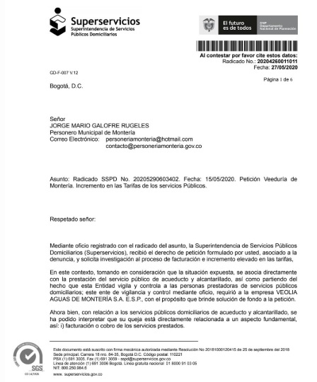 Así las cosas, el representante del Ministerio Público requirió Veolia Aguas de Montería S.A.E.S.P., con el propósito que brinden solución a fondo de la petición que fue realizada por la Personería sobre la investigación al proceso de facturación e incremento elevado en las tarifas.